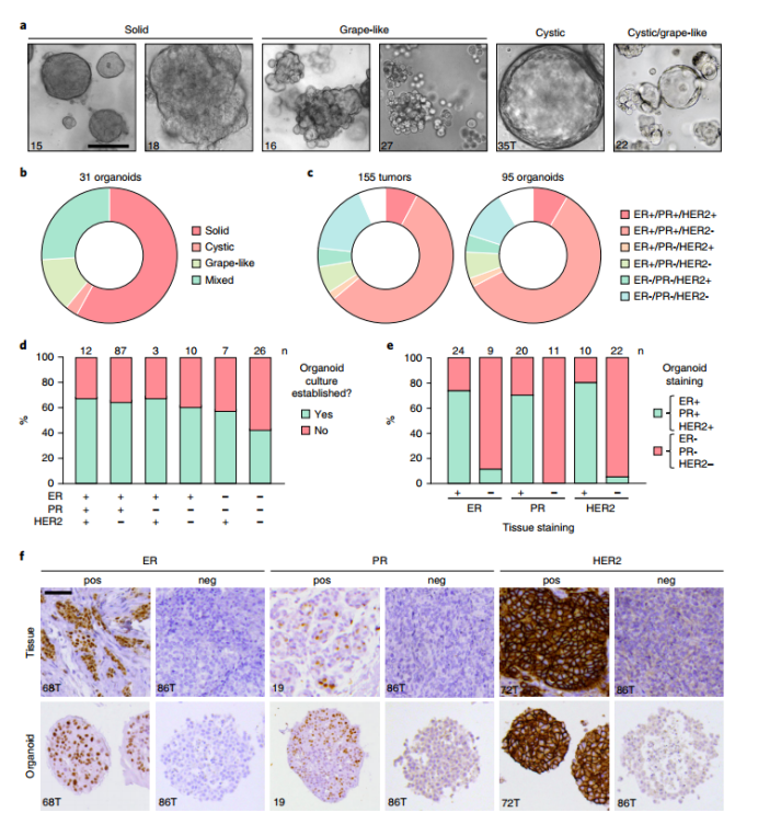 图3.BC 类器官培养物性状 a,BC类器官不同形态的代表性图像。b,圆环图描绘了 31 个 BC 类器官培养物的主要形态分布。c,155 个组织样本和 95 个相关类器官培养物中 BC 亚型的分布。d,堆积条形图显示类器官建立的成功率,按受体表达状态分组。“是”表示成功建立(> 5 次体外传代);‘No’表示建立不成功。 e,堆积条形图,显示与原始组织受体状态相比,具有阳性(绿色)或阴性(粉色)受体状态的类器官培养物的百分比。 f,BC 组织和衍生类器官的比较免疫组织化学图像,受体阳性 (pos) 和受体阴性 (neg) 样本的代表性图像。