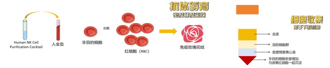 基于密度梯度离心原理,只需在全血中加入K005人NK细胞纯化试剂盒,进行孵育,运用密度梯度离心,无需昂贵、复杂的磁分选或流式分选设备,省时省力省预算。